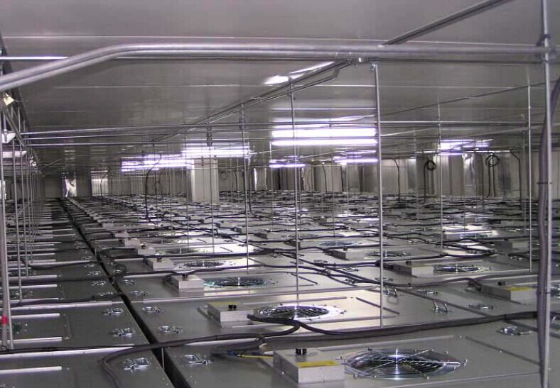 是風(fēng)機和FFU高效過濾器的組合,也可稱為“自帶風(fēng)機的過濾設(shè)備”。FFU通常安裝在潔凈室 的送風(fēng)末端,一般放置在吊裝的“干式”墊片密封龍骨框架上。FFU上面部分為風(fēng)機模塊,下面部分為過濾 器。根據(jù)潔凈度的要求,過濾器可為不同等級的高效(HEPA)或超高效(ULPA)過濾器,為潔凈室提供潔 凈空氣。風(fēng)機模塊除了要克服FFU下部高效過濾器的阻力,還要克服整個循環(huán)風(fēng)所有通道部件的阻力,從而 維持設(shè)定的運行風(fēng)速。FFU系統(tǒng)具有設(shè)計施工簡便,風(fēng)速調(diào)節(jié)靈活,潔凈區(qū)易于變更等特點,因此已成為工業(yè)潔凈室的流行系統(tǒng)形式之一。