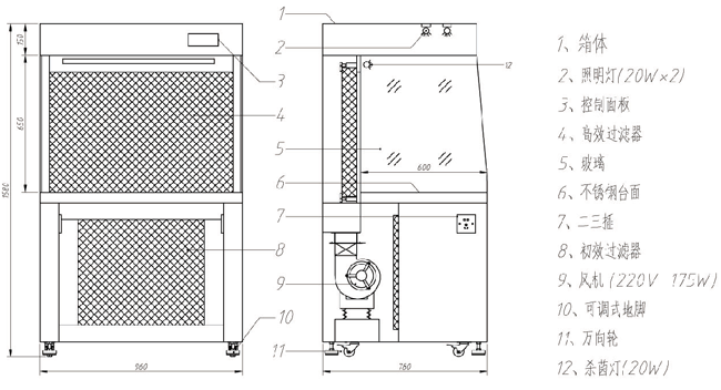 1、采用超薄型的無隔板過濾器,將靜壓箱尺寸縮到最小,配以不銹鋼臺面和玻璃側擋板,使整個工作區顯得寬敞明亮;