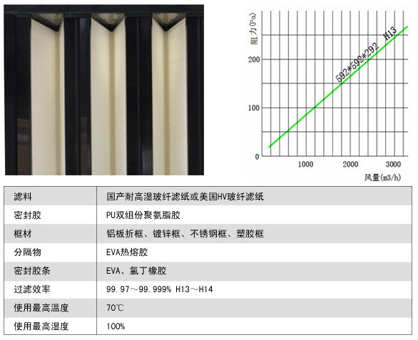 2.濾料采用耐高濕超細(xì)玻璃纖維濾紙制成,以鋁箔板做分隔。波紋形紙隔板或鋁隔板維持每一褶紙之間等距間隔,氣流易于穿過,確保濾材有效利用及增加強(qiáng)度。