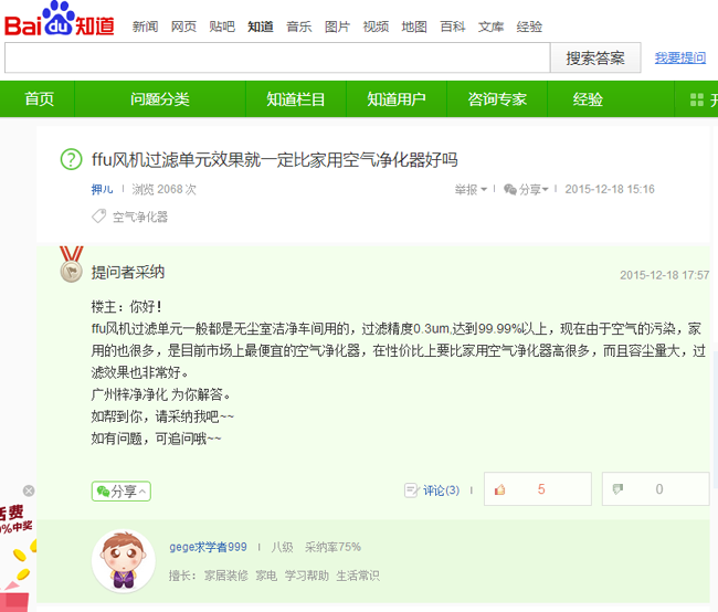 廣州梓凈在百度知道中問答有關(guān)FFU風(fēng)機(jī)過濾單元相關(guān)問題